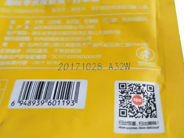 Lebensmittelverpackung ist ein wichtiger Bestandteil der Sicherstellung von Lebensmittelsicherheit. Wir können wirksame Informationen wie Produktionsplätze erhalten, Zutaten, Haltbarkeits- und Speicherbedingungen durch Verpackung. Die traditionelle Tintenstrahl -Codierung hat das Problem von “leicht zu löschen und abfallen”. Das Laserdrucksystem kann nicht nur Textinformationen und einen zurückführbaren QR -Code oder den DM -Code markieren, Helfen Sie den Lieferanten, nachzuverfolgen und zu verwalten, Integrieren Sie aber auch den Markierungsprozess in den gesamten Produktionsprozess, um die Effizienz zu verbessern.