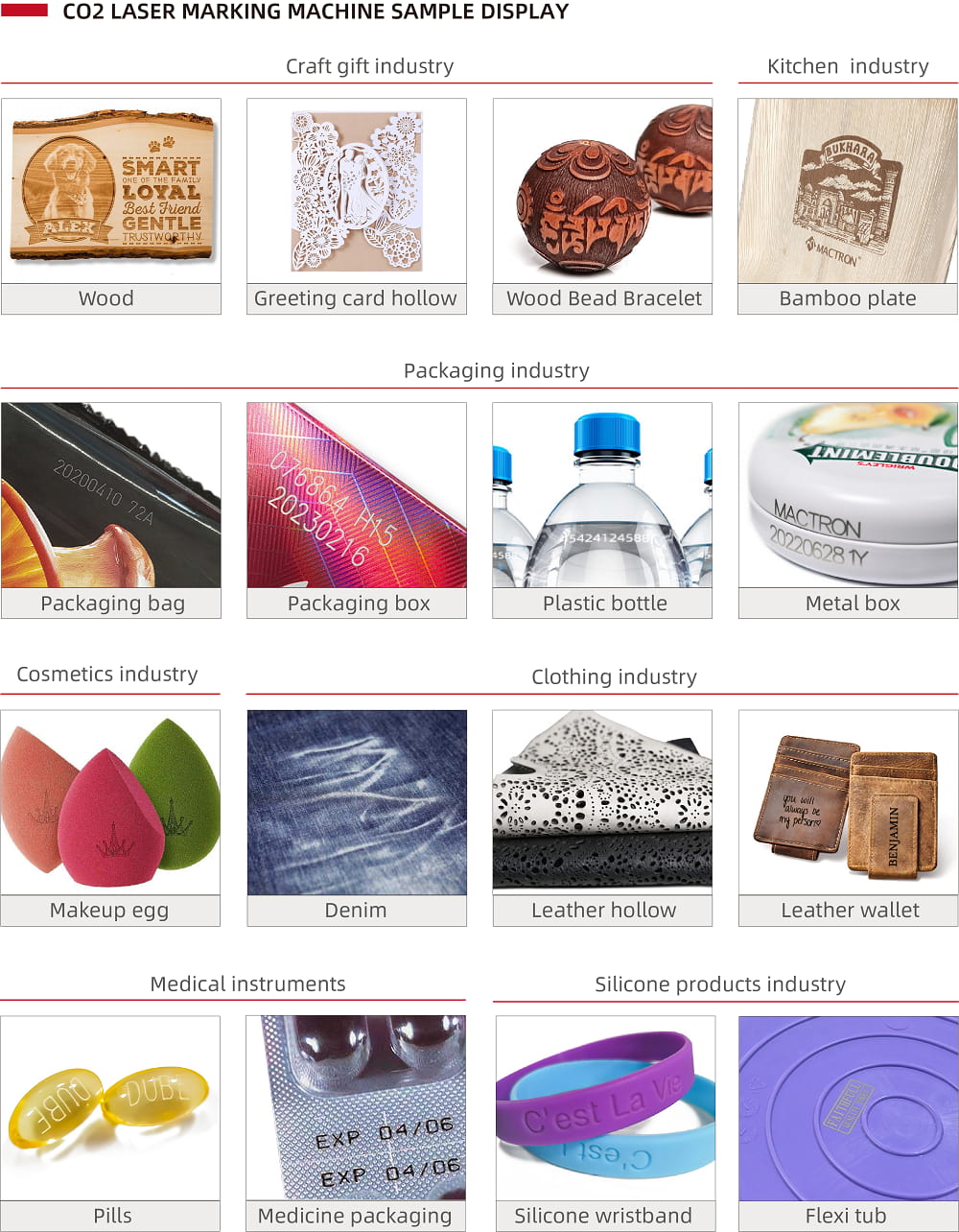 Station co2 laser marking machines are incredibly versatile and can mark a wide array of materials and products with high precision and detail. They can engrave on natural materials such as wood, leather, and textiles, as well as synthetic materials like plastics, including acrylic, polycarbonate, polyethylene, polypropylene, and ABS. Additionally, these machines can mark on glass, ceramics, rubber, paper, and cardboard.