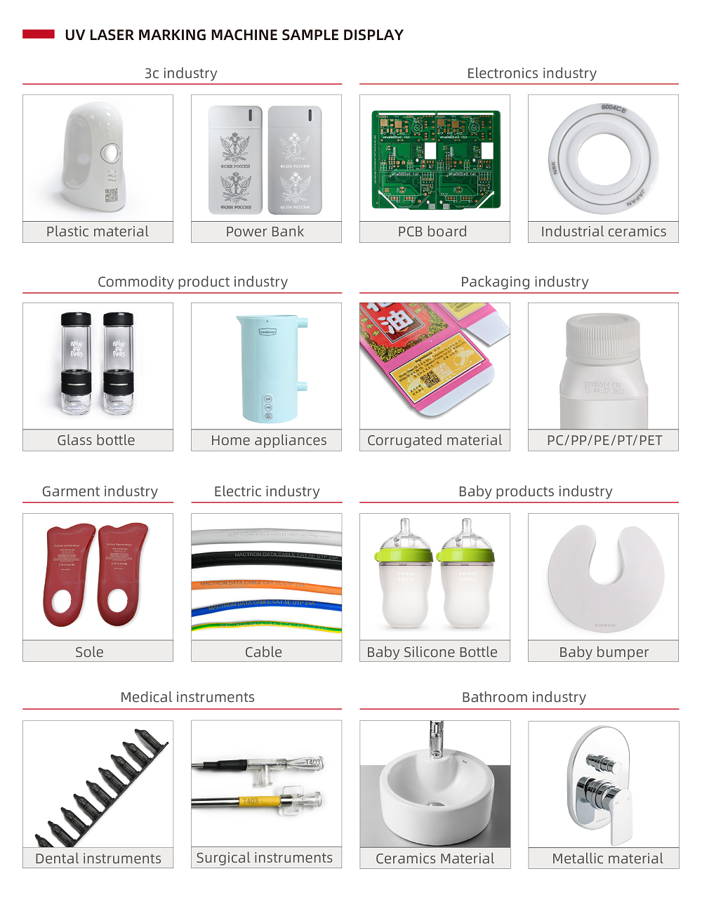 The UV laser printer is suitable for all kinds of metal and non-metallic materials, such as paper, PVC, ABS, HDPE, rubber, wood, glass, ceramic, plastic, etc. And it is widely used in packing boxes, packaging bags, films, food cans, glass bottles, beverage bottles, cables, pipes, drug packaging, electronic components, bathroom products and automobile industries.